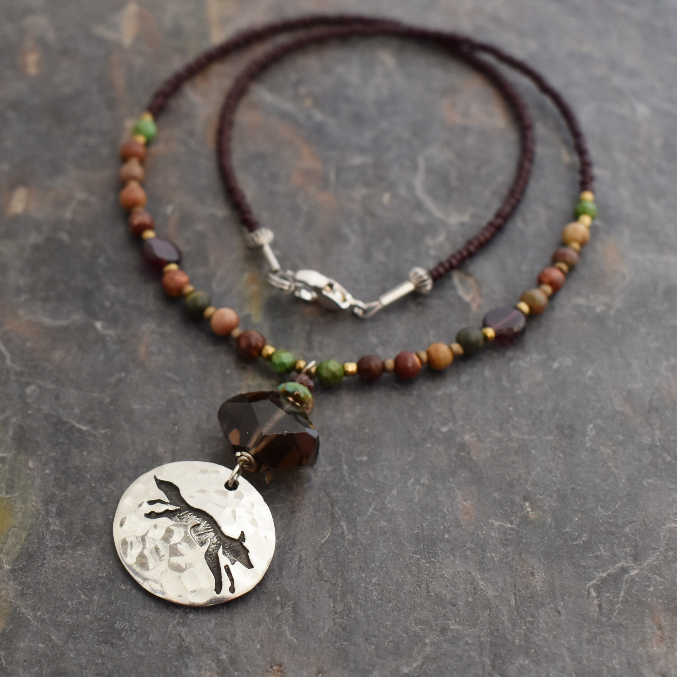 With natural green turquoise, cherry creek jasper, garnet, and faceted smoky quartz gemstones, dark red brown, bronze glass seed beads, copper spacers, and a silver pewter fox pendant.