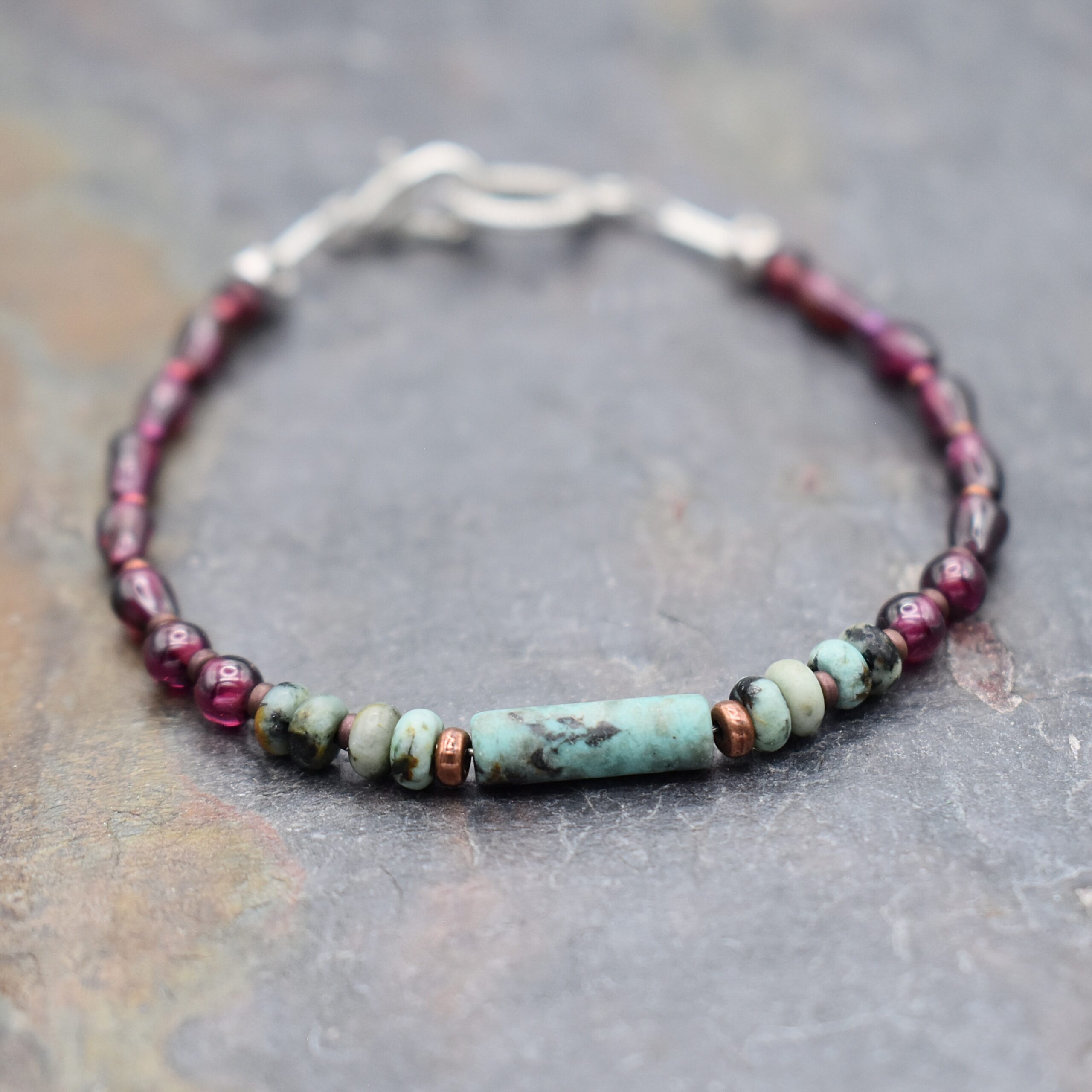 Beautiful natural garnet, turquoise gemstones with glass seed beads, and copper spacers & pewter end beads.