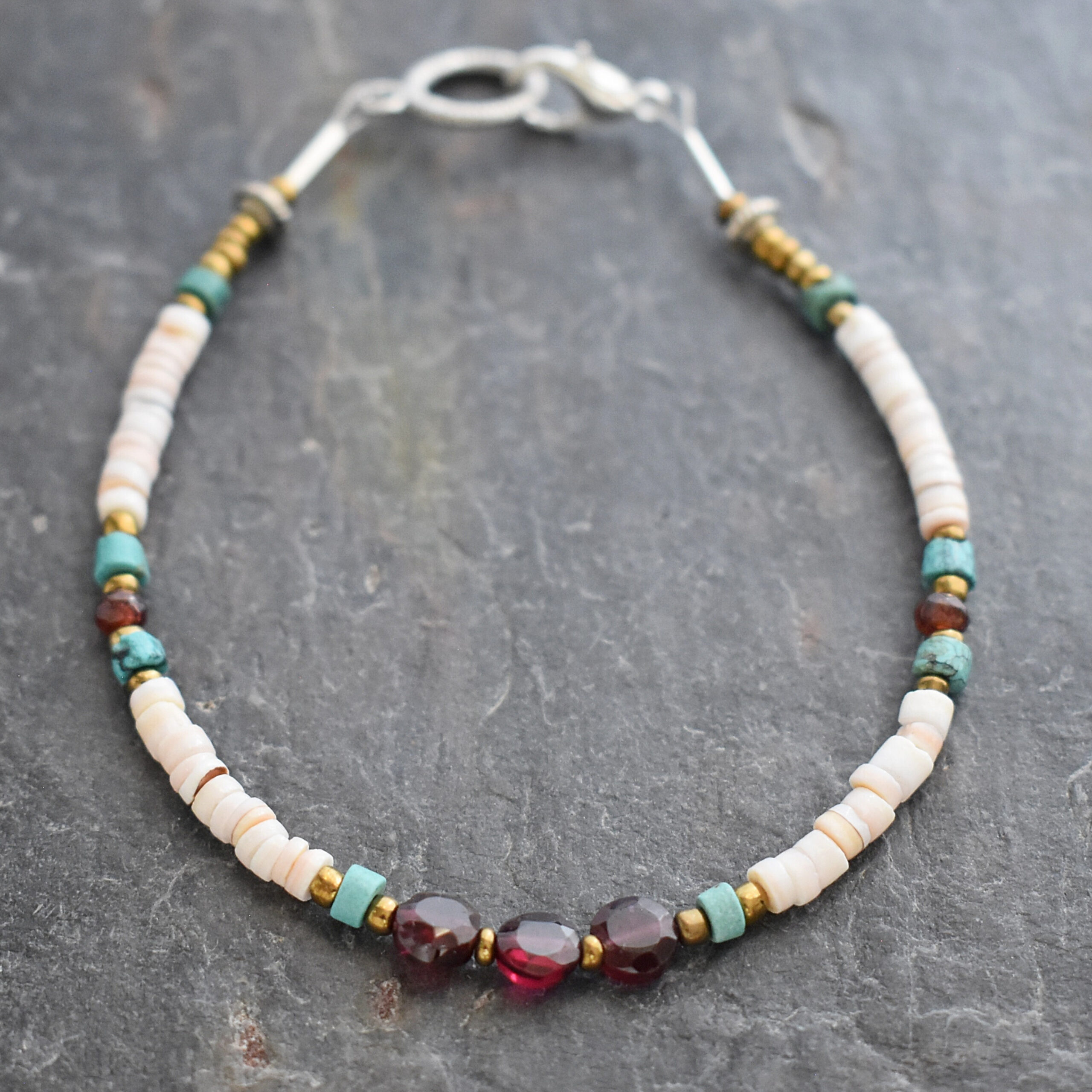 Beautiful pink strawberry shell, natural garnet, turquoise gemstones with gold glass seed bead spacers & pewter end beads.