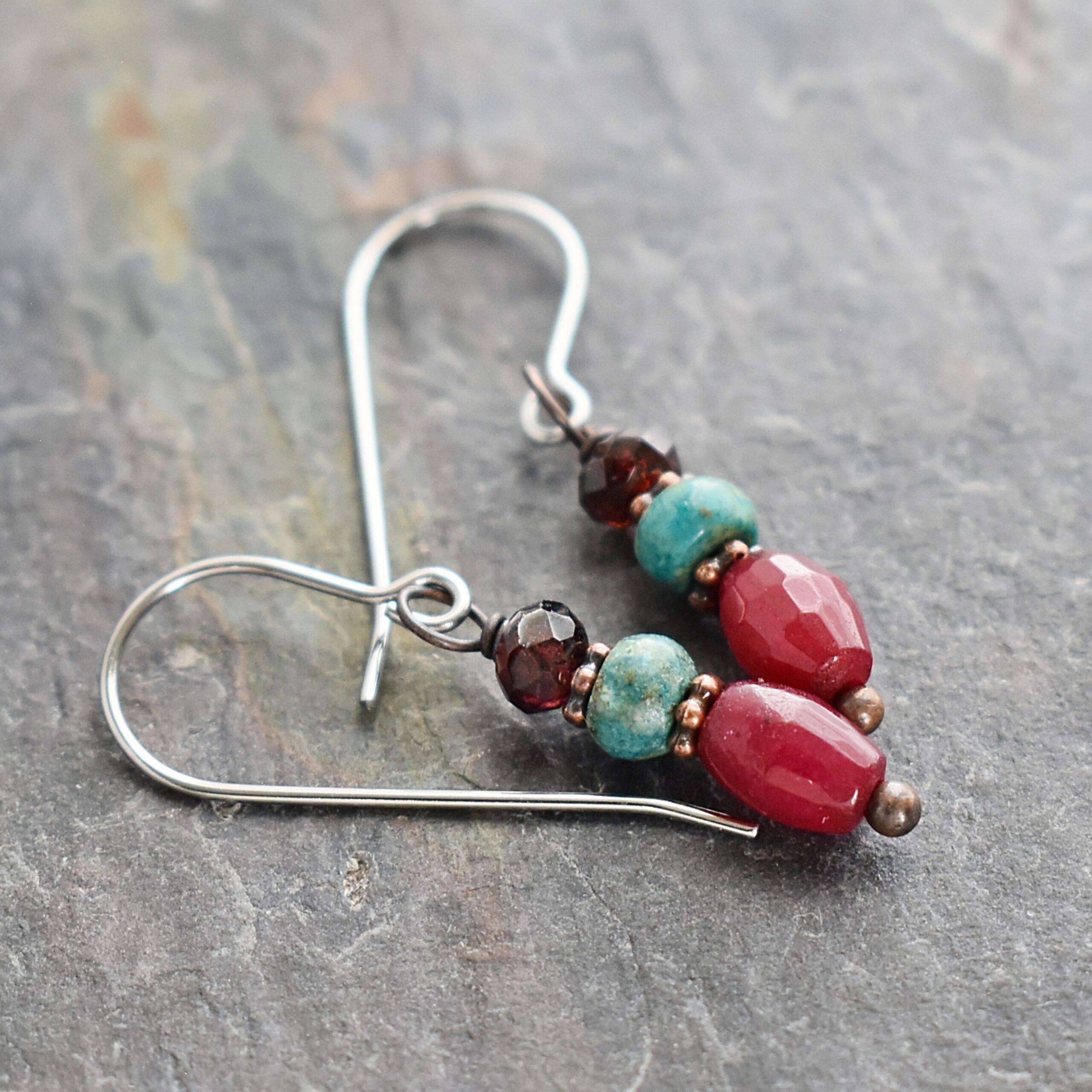 Beautiful faceted red, turquoise, and ruby jade natural gemstones with copper pewter spacers.