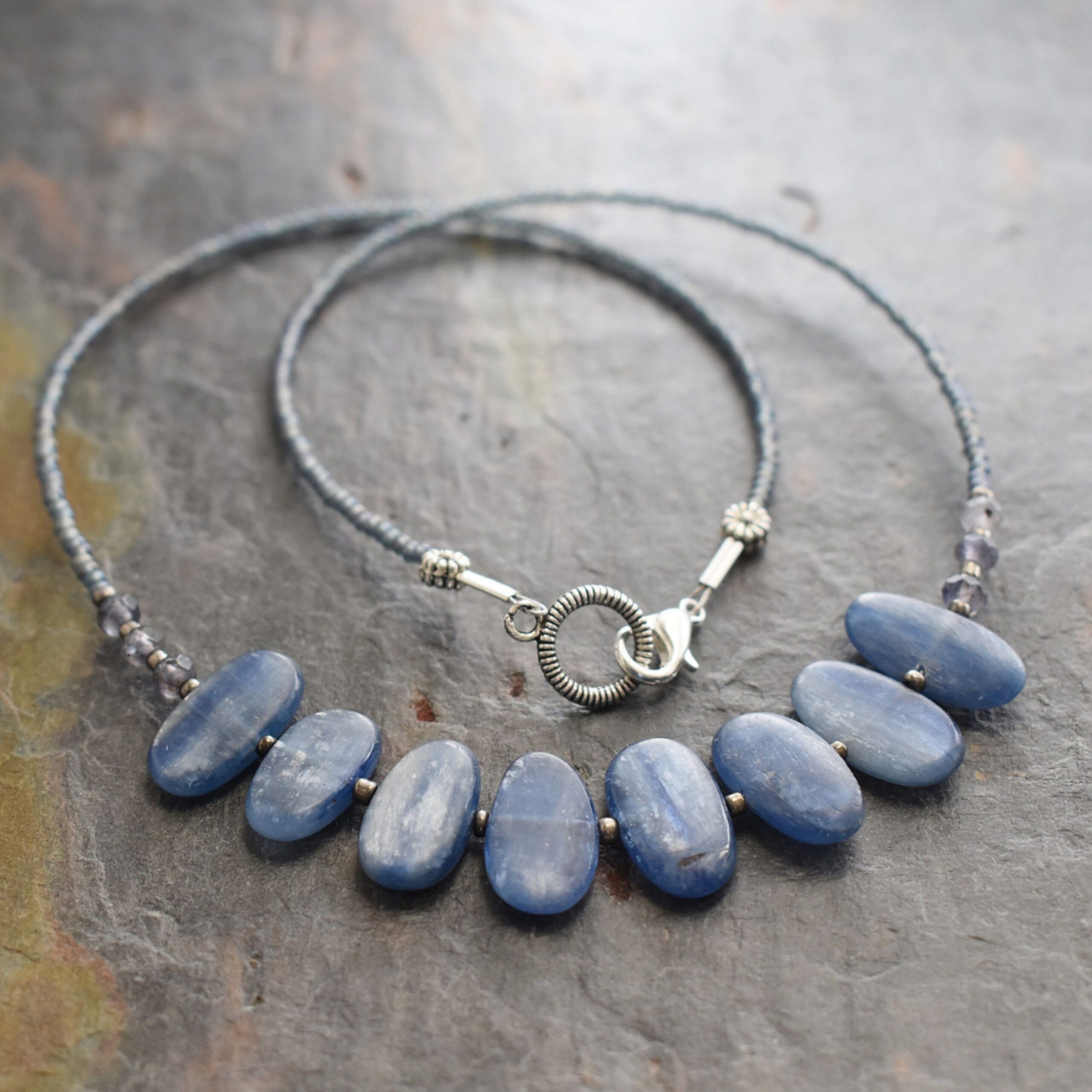 With natural iolite gemstones, blue kyanite pebbles, and gray-blue, pewter glass seed beads, with silver pewter end beads.