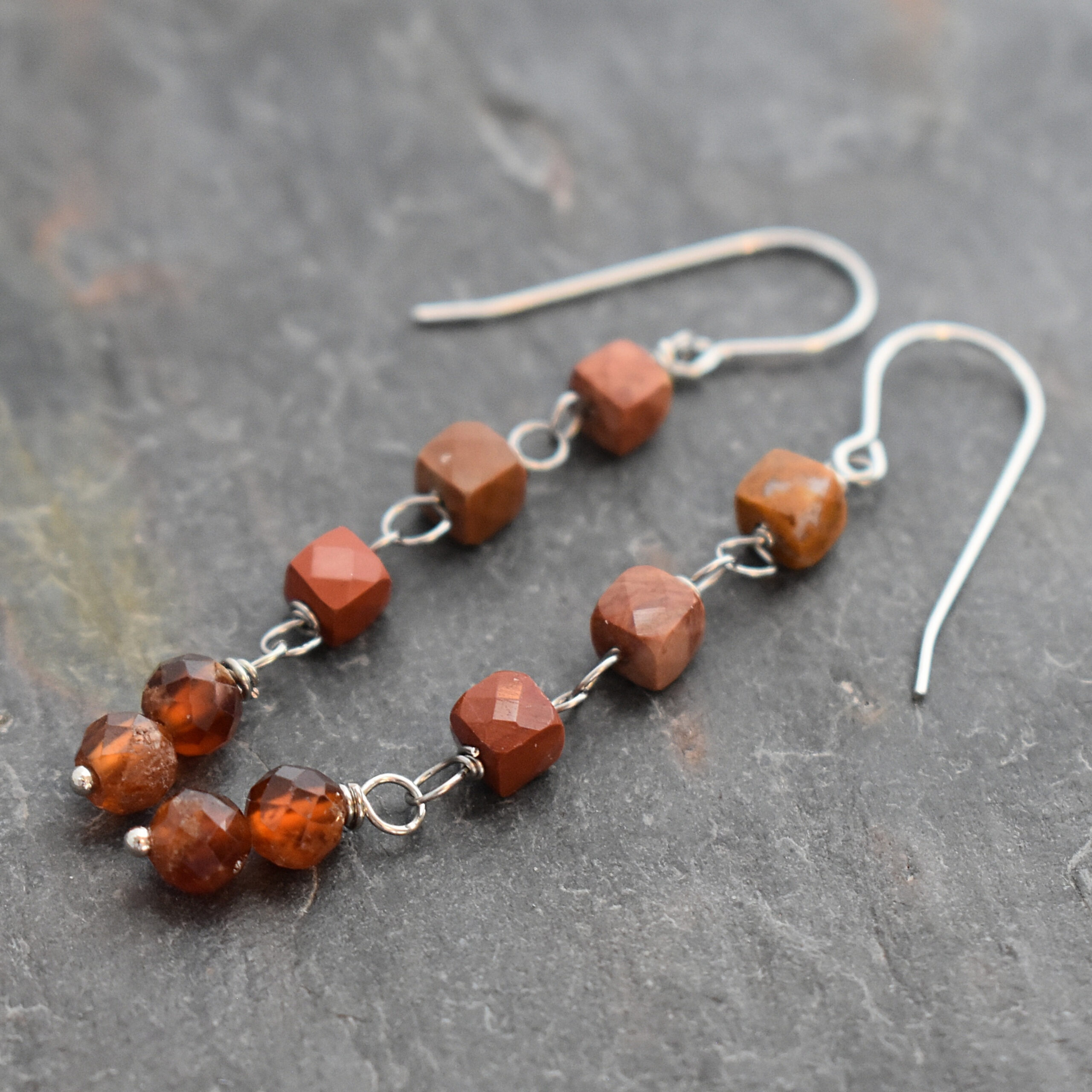 Beautiful natural brown rust creek jasper cubes and faceted hessonite garnet gemstones hand-wrapped on stainless steel.