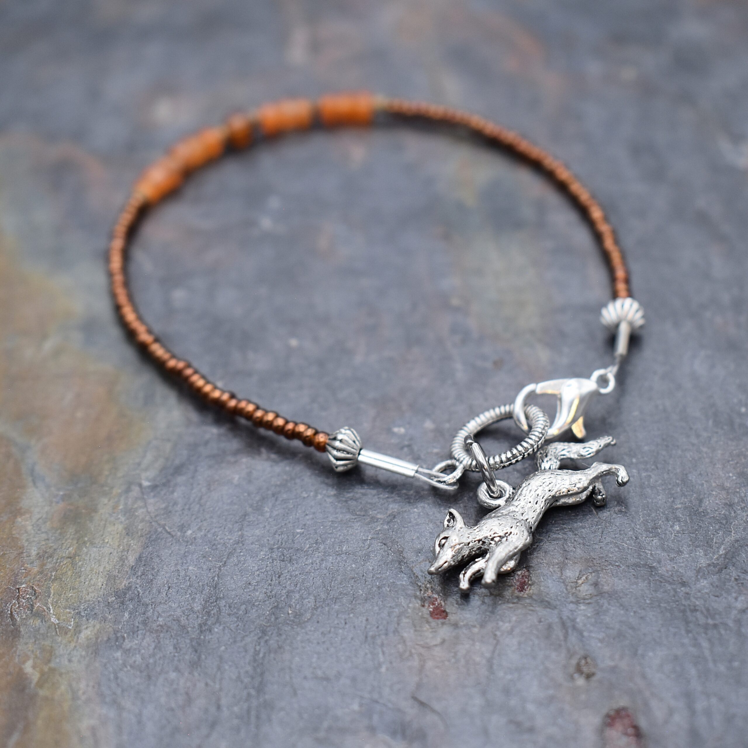 With bronze and copper glass seed beads, beautiful faceted natural carnelian and hessonite garnet gemstones, with a silver pewter running fox charm & end beads.